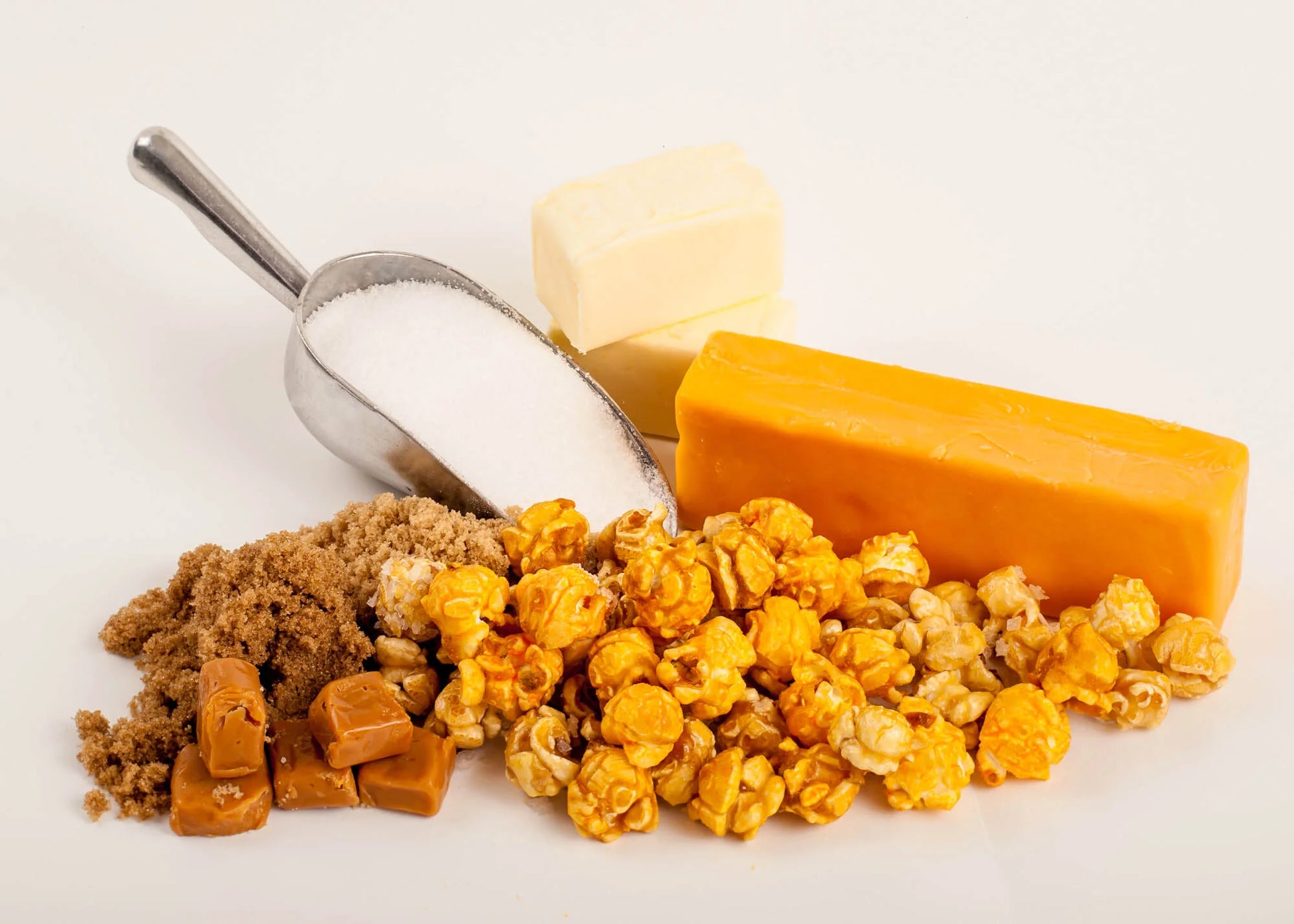 Whole Grain Non-GMO Popcorn, Coconut Oil, Corn Oil (for caramel batches), Light Brown Sugar, Natural Cane Sugar, Corn Syrup Solids, Cheddar Cheese Powder (Milk, Cheese Cultures, Salt, Enzymes), Butter (Cream, Salt), Less Than 2% of: Canola Oil, Annatto (for color), Madagascar Bourbon Vanilla Extract, Popcorn Salt.