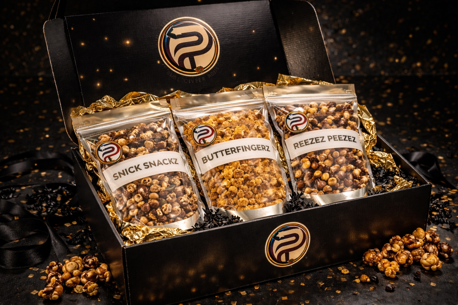 Inside, they’ll discover three curated gourmet popcorn flavors, nestled in gold-foiled protective wrap and black crinkle shred that enhances the luxe unboxing experience.